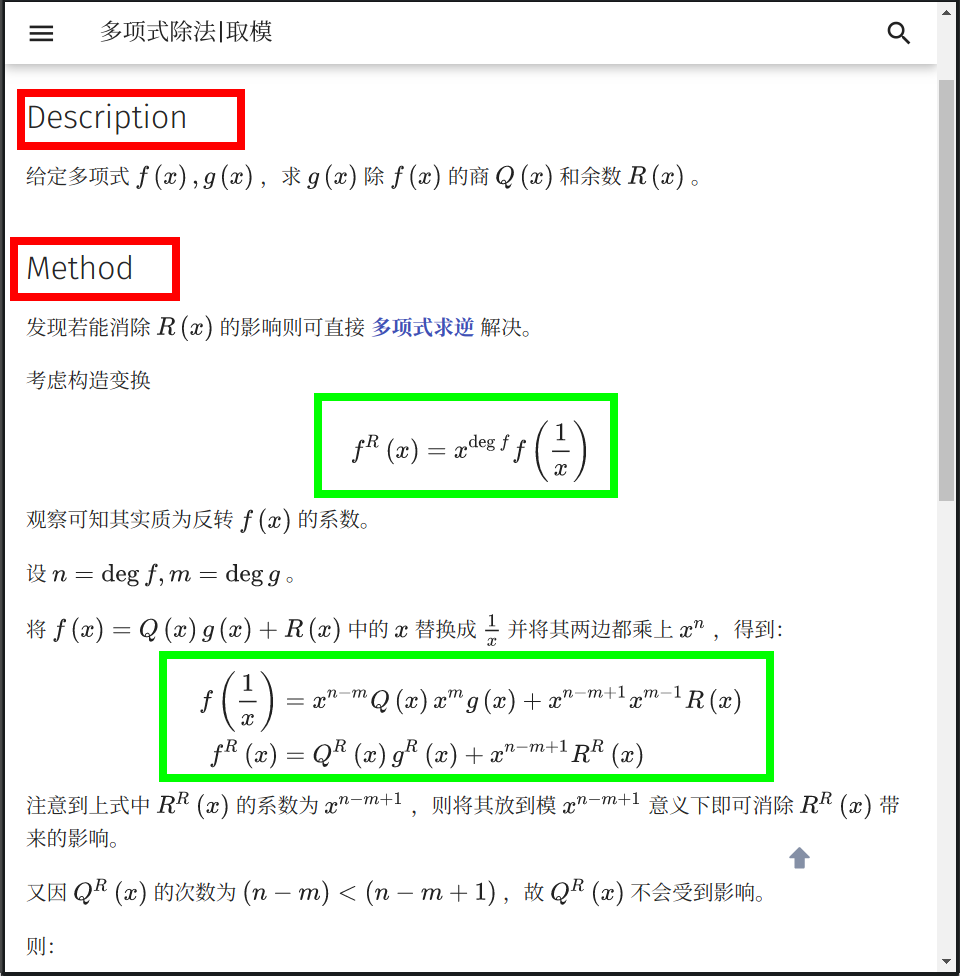 使用 MkDocs 扩展语法,让例题题面与算法描述区分开。将代码折叠,可以让文章更紧凑。(毕竟看 Wiki 的大多数是了解思路,除了模板代码需要阅读外,习题的代码大多可以折叠。)在描述函数操作时,使用行内代码和 LaTeX 公式都是不错的选择。